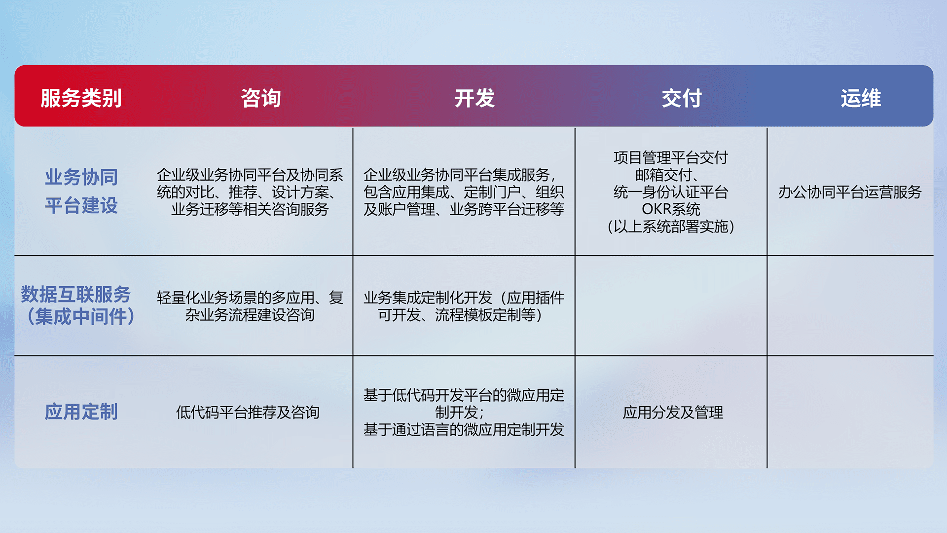 针对钉钉、、企微、、、IDaas等平台级产品提供产品的规划、、、、方案、、、交付、、、定制化开发等服务,,,实现如统一协同办公、、、、智能客户服务、、、、混合会议管理、、、、智能数据查询、、、、等业务场景,,实现数字化转型。。。。